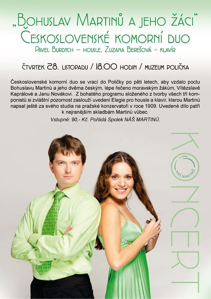 Československé komorní duo se vrací do Poličky po pěti letech. Zatímco tehdejší prosincový koncert v sálku CBM byl věnován nejvýznamnějším jubilantům Roku české hudby 2014, letos přijedou oba umělci, aby vzdali poctu Bohuslavu Martinů a jeho žákům. Netřeba zřejmě připomínat, že jedinými českými, lépe řečeno moravskými žáky slavného poličského rodáka byli skladatelka a dirigentka Vítězslava Kaprálová (Paříž 1938 - 1940) a skladatel Jan Novák (New York 1947 - 1948). Z bohatého programu složeného z tvorby všech tří komponistů si zvláštní pozornost zaslouží uvedení Elegie pro housle a klavír, kterou Martinů napsal ještě za svého studia na pražské konzervatoři v roce 1909. Uvedené dílo, které autor opatřil tajuplným podtitulem „Zlo se vrací“, patří k nejranějším skladbám Martinů vůbec (v Halbreichově chronologickém katalogu skladeb mu patří třetí příčka).