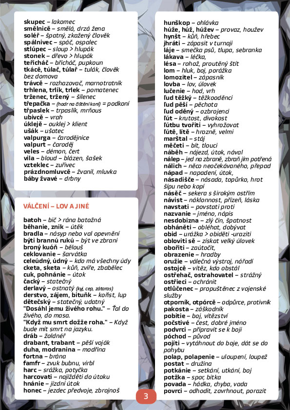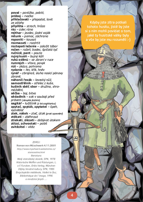 Historie je plná různých slov, která se nám mohou zdát až nesmyslná, například víte, co znamená věta: „Hlásní pozední říkal, že Jan Žižka má barbar až na jahódce?“ Zajímá vás, co nás vedlo k tomu přestat tyto výrazy používat? Pojďme se společně naučit několik středověkých slov, která možná používali i husitští bojovníci. Ti starší se mohou přiučit tomu, jak složitou cestu čeština musela ujít, než se ustálila do podoby, jakou známe dnes. A že to byla cesta! Věděli jste, že nejstarší předpísemné období datujeme už do 10. století? V příloze naleznete nejen slovník, ale také historická fakta a zajímavosti.